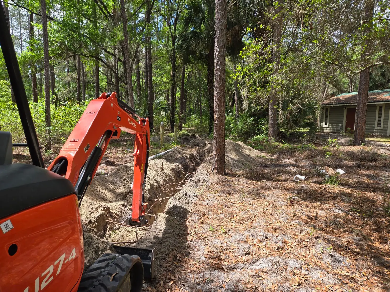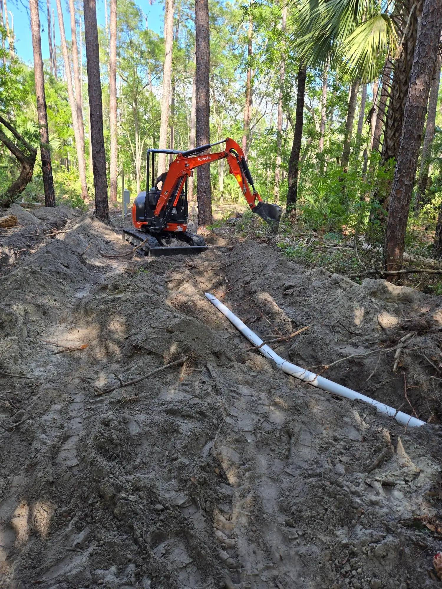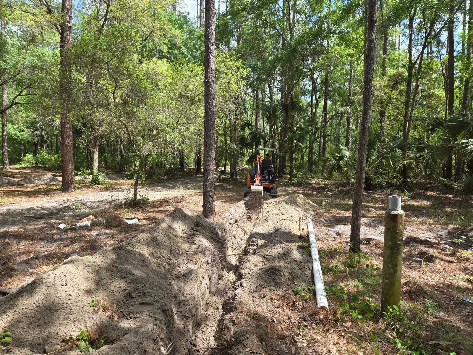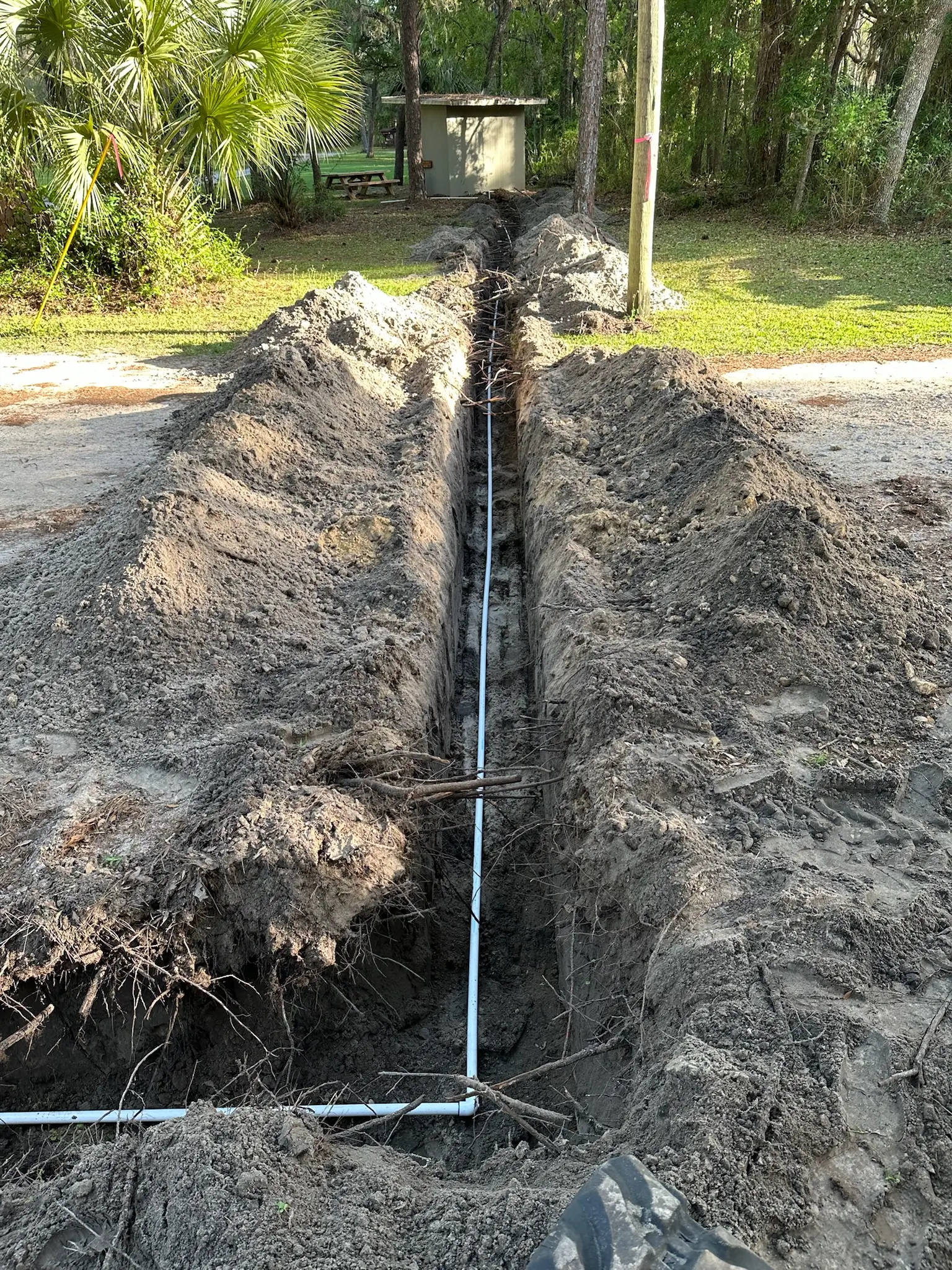 PureGreen Plumbing LLC completed a utility infrastructure project at Goethe State Forest – Tidewater Trails, supporting the expansion of RV camping facilities within the park. The project focused on extending water and sewer services to accommodate multiple RV hookups across the property. Our scope of work included the installation of over 2,000 linear feet of 1-inch water main, supplying potable water to six separate RV service locations throughout the campground. In addition, we installed approximately 200 linear feet of new 4-inch sewer main, providing a designated pump-off location for RV waste disposal. All trenching and excavation was completed using a mini excavator, allowing for efficient installation while minimizing environmental impact to the surrounding forested area. The project was completed with a focus on durability, accessibility, and long-term use in a public recreation setting.